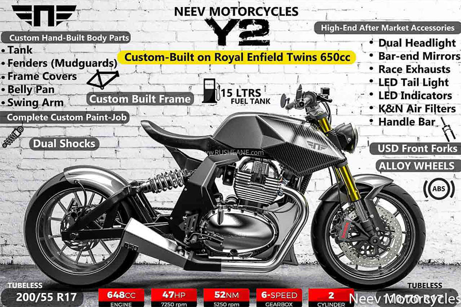 อย่างไรก็ตามแบรนด์รถจักรยานยนต์ของเจนไนที่ชื่อว่า ‘650 Twins’ ไม่ค่อยได้รับความนิยม ในการปรับแต่งมากนัก ด้วยฐานเครื่องยนต์ที่เหมาะสมของรอยัล เอนฟิลด์ รุ่น Interceptor 650 และ Continental GT 650 จะเป็นตัวเลือกแรกที่ได้รับความนิยมมากกว่าสำหรับการปรับสมดุลระหว่างรูปทรงและฟังก์ชั่น แต่ว่าสำนักแต่งรถ Neev Motorcycles ในเดลี ได้เปิดตัวแนวคิดใหม่ที่ใช้รอยัล เอนฟิลด์ ‘650 Twins’ มาปรับแต่ง และขนานนามว่า ‘Y2 650’