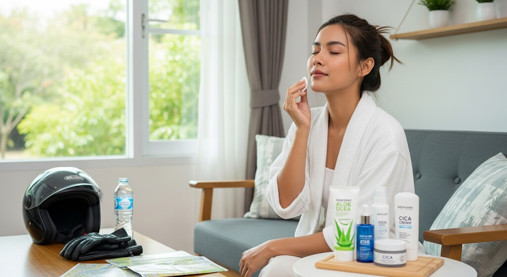- สกินแคร์ปลอบประโลมผิวหลังจบทริป เช่น Aloe Vera, Centella Asiatica, Green Tea